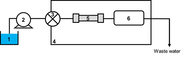 ![]() 図1 イオン性栄養塩類の分離を目的に、使用した装置の構成11) 1:ギ酸ナトリウム溶離液、2:送液ポンプ(0.25 mL/min)、3:試料注入器(20 µL)、