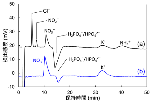 ![]() 図3 最適分離条件による(a)標準試料及び(b)液体肥料試料のクロマトグラム11)