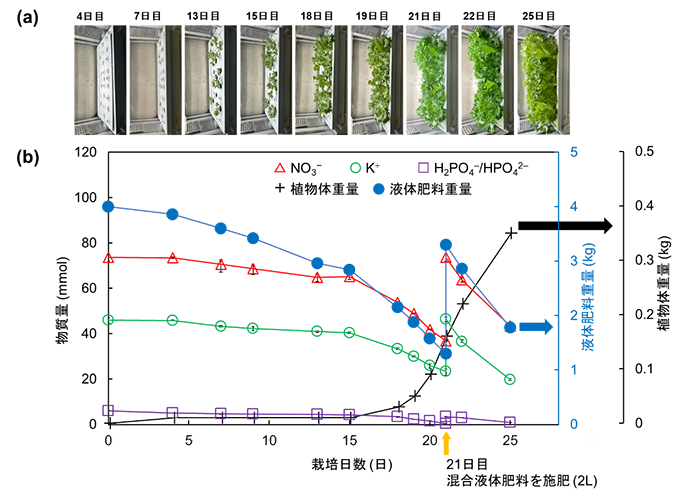 ![]() 図5 水耕栽培において追肥に単独液体肥料を用いた際の(a)レタスの生育状況と(b) 液体肥料中のイオン性栄養塩類の濃度、植物体重量及び液体肥料重量の変化11)