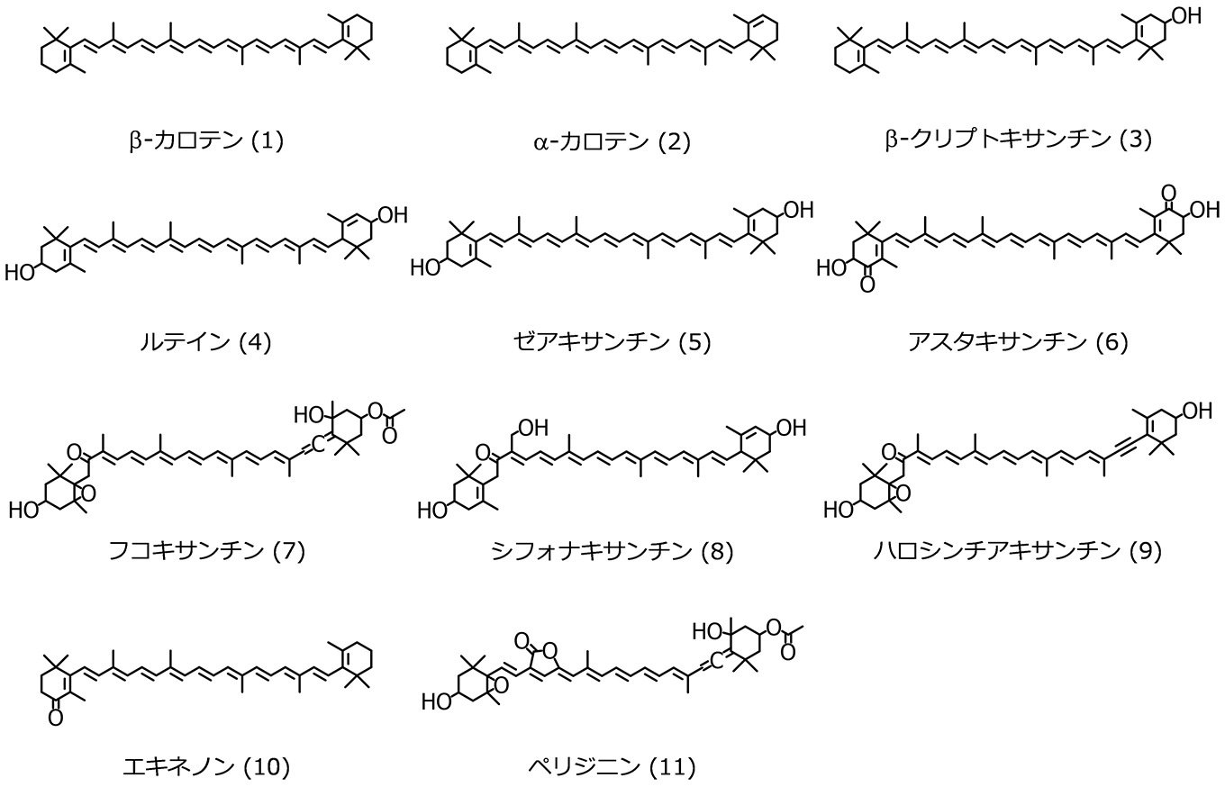 ![]() 図1. マリンカロテノイドの化学構造の例 カロテノイド名の後に付記した数字は本文中の番号と対応している。