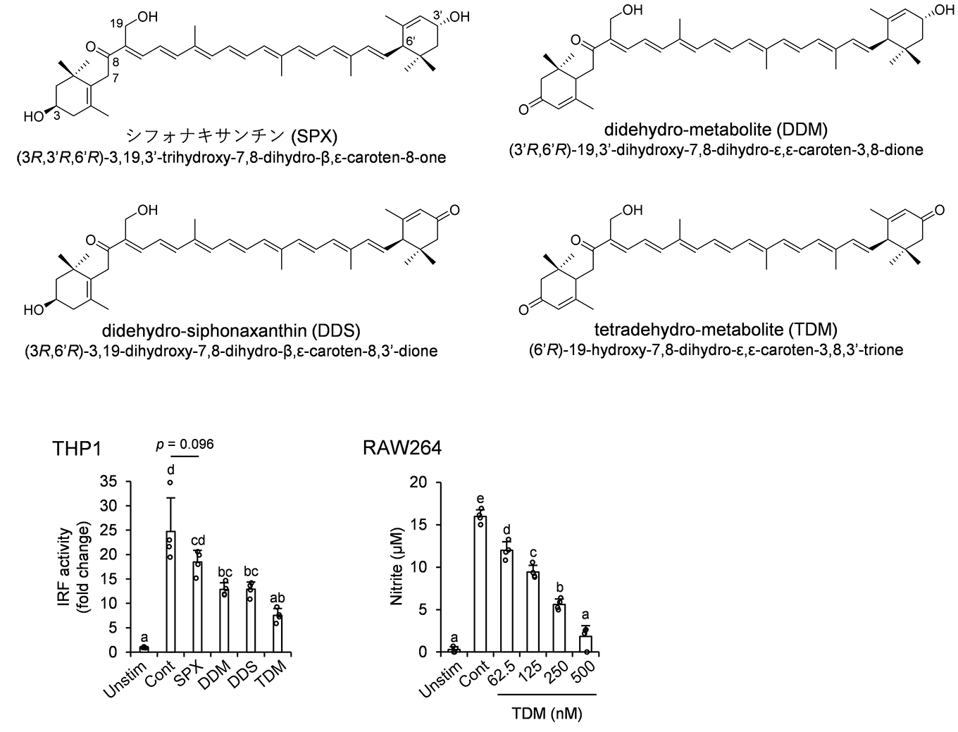 ![]() 図2. シフォナキサンチンのデヒドロ体とその抗炎症作用(参考文献4より一部改変) グラム陽性細菌の細胞膜成分を模倣したトリアシルリポペプチドを用い、ヒト単球様THP1細胞またはマウスマクロファージ様RAW264細胞に炎症応答を誘導した。THP1細胞ではインターフェロン調節因子(IRF)の転写活性化レベルをレポータージーンアッセイを用いて評価した。また、カロテノイドの濃度は1.0 μMとした。RAW264細胞では培養上清に放出された一酸化窒素量を炎症応答の指標として評価した。Unstimは炎症応答を誘導していないコントロール、Contはカロテノイドで処理せずに炎症応答を誘導したコントロールを表す。