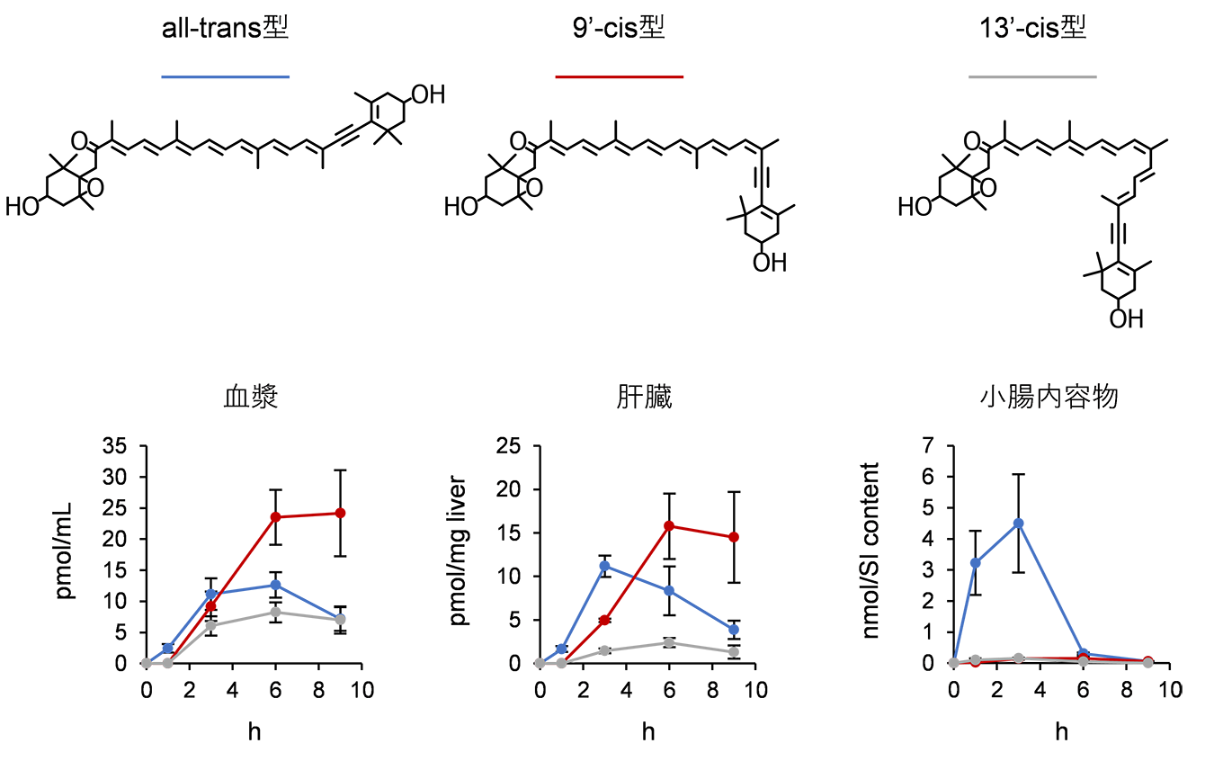3. ハロシンチアキサンチンのシス-トランス異性化反応(シス体の生成)ハロシンチアキサンチンは、フコキサンチンがマボヤによって代謝変換されたカロテノイドである。これまでに抗炎症作用6やがん細胞に対するアポトーシス誘導作用7が報告されているが、個体レベルにおけるハロシンチアキサンチンの生物活性を評価した例はなく、経口摂取したハロシンチアキサンチンが消化管から吸収されるかどうか明らかではなかった。そこで精製したハロシンチアキサンチンをマウスに経口投与し、一定時間後の血漿カロテノイド組成を調べたところ、投与したall-trans型ハロシンチアキサンチンが確かに検出されるものの、投与6および9時間後では9’-cis型がall-trans型よりも多く検出された(図3)8。また、13’-cis型ハロシンチアキサンチンも投与6時間後まで時間経過と共に増加していた。肝臓においても同様の傾向が認められたが、小腸内容物では投与9時間後にようやく9’-cis型がall-trans型と同程度になるなど、9’-cis型の増加が血漿や肝臓よりも遅れていた。アスタキサンチンではcis型の方がall-trans型よりも消化管吸収性が良いとの研究報告があるが9、このハロシンチアキサンチン投与実験の結果は、all-trans型ハロシンチアキサンチンが消化管から吸収され、生体内で9’-cis型に異性化されたと考える方が自然であろう。現在、マウスの肝臓を中心にカロテノイド異性化酵素の探索を進めている。また、アスタキサンチンやフコキサンチンではcis型の方が強い生物活性を示すとの報告があるため10, 11、9’-cis型や13’-cis型ハロシンチアキサンチンの抗炎症作用にも興味がもたれる。
