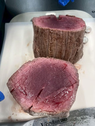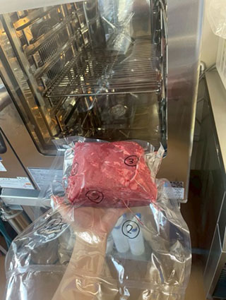 ① 肉塊の表面から1cmの深さにボタン電池型の温度センサーを複数箇所に埋め込む ② 真空包装後に加熱装置(スチーム・コンベクションオーブン)で加熱し、すべてのセンサーが60℃以上になった時間を確認する。その時間に2分追加して加熱殺菌時間を決定する ③ 加熱後の肉塊表面のトリミング ④ 加熱変色部分をトリミングした後に内部の赤身部分を冊状にしたもの。この肉25gに対して腸内細菌科菌群検査を実施し、陰性の場合に生食用食肉の成分規格適合となる ⑤ 6.7kgの肉塊を用いて加熱した際の温度センサーの温度上昇