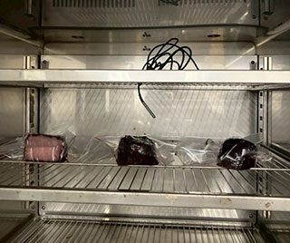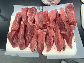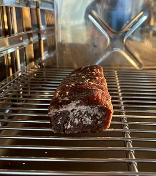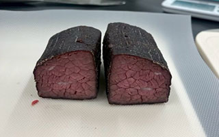 加熱殺菌加工後には、腸内細菌科菌群の検査を行い、陰性であることを確認する必要があります。施設独自の加熱の方法を決定した後、営業として加工を行うためには、再現性の確認のために、加熱した肉塊の腸内細菌科菌群の検査(1検体25gを25検体分)を実施して、すべて陰性であることを確認します。加熱殺菌に係る温度・時間の記録を1年間保管することも必要であり、継続的に加工を実施するには、1年に1回、肉塊の腸内細菌科菌群の検査(1検体25gを25検体分)を実施することが必要となります。 生食用食肉だけでなく、津山地域に伝わる牛肉の食文化である干し肉についての研究も実施しています。干し肉は保存性を高める伝統的な加工技術であり、近年では高タンパク・低脂肪の健康志向食品として再評価されています。しかし干し肉は、微生物学的衛生状況、旨み成分や保存性に関する詳細な研究はほとんど行われておらず、未解明な点も多い食品です。そのため、著者らは干し肉の製造条件と製造後の微生物学的状況の確認(一般細菌、黄色ブドウ球菌、リステリア菌等)及び水分活性の測定、保存期間中の品質保持状況等について検討し、科学的根拠に基づく干し肉の優位性に関する知見を蓄積することにより地域資源としての干し肉の消費拡大を目指しています(図4)。